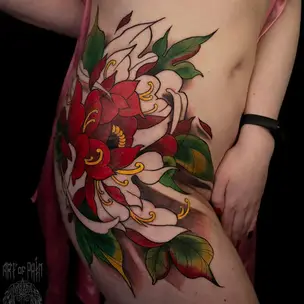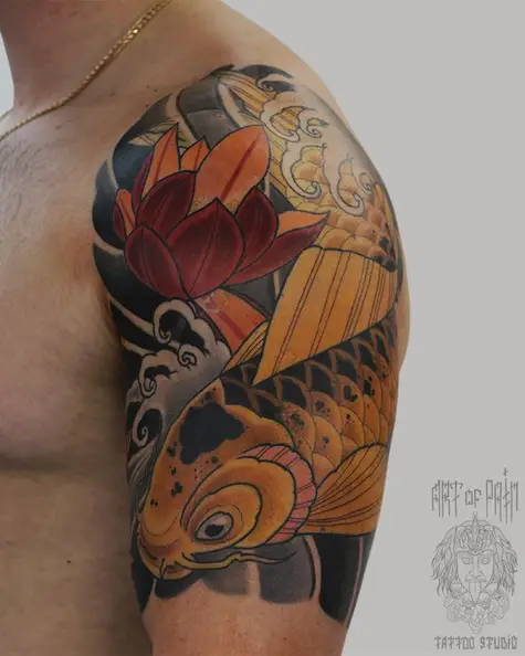 Татуировка мужская япония на плече карп и красный лотос 2588