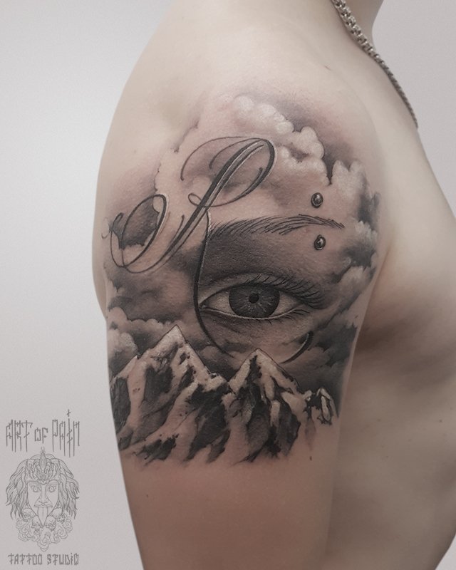 Татуировка мужская black&grey на плече глаз и горы 2595