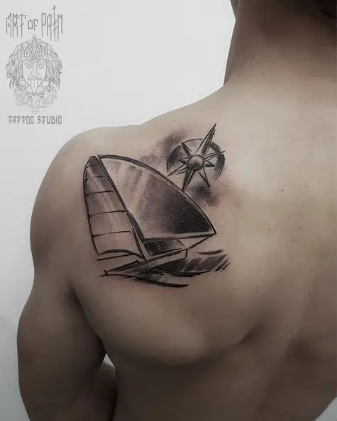 Татуировка мужская графика на лопатке парусник 2597