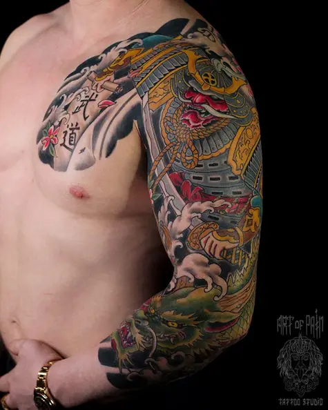 Татуировка мужская япония тату-рукав самурай и дракон (Ольга Добрякова) 2607