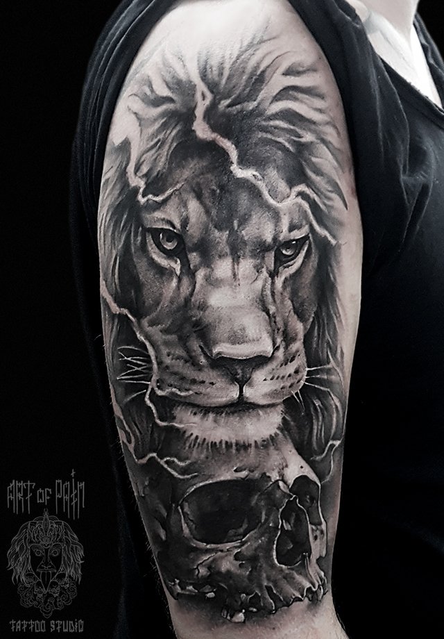 Татуировка мужская black&grey на плече лев и череп 2618