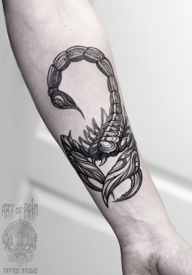 Татуировка мужская графика на предплечье насекомое - скорпион 2645