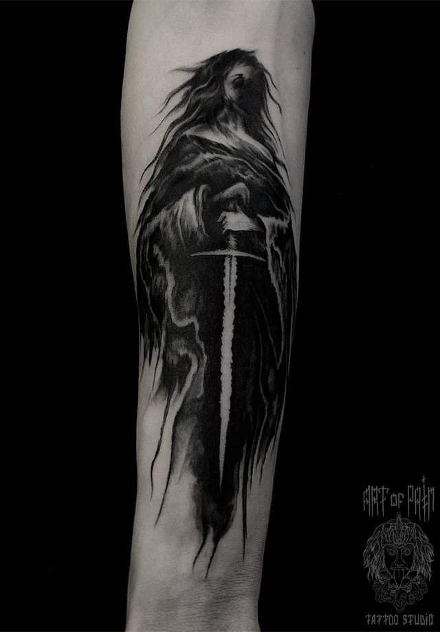 Татуировка мужская хоррор на предплечье девушка с мечом 2649