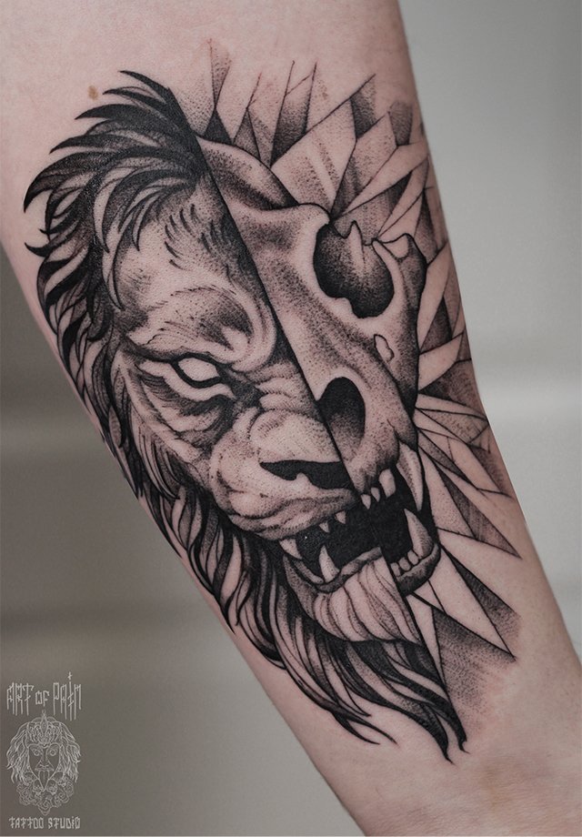Татуировка мужская графика на предплечье лев с черепом 2699