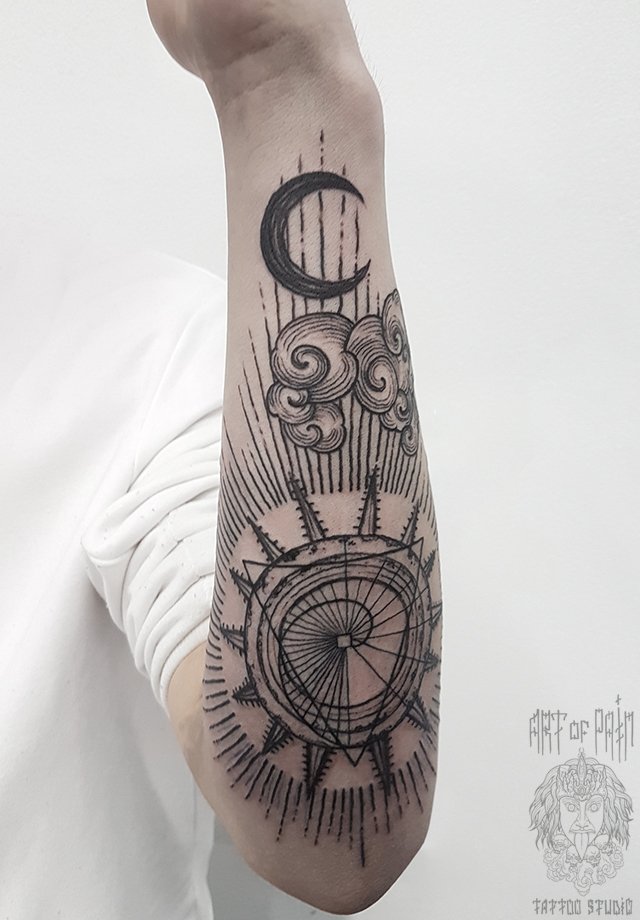 Татуировка мужская графика на предплечье солнце и луна 2741