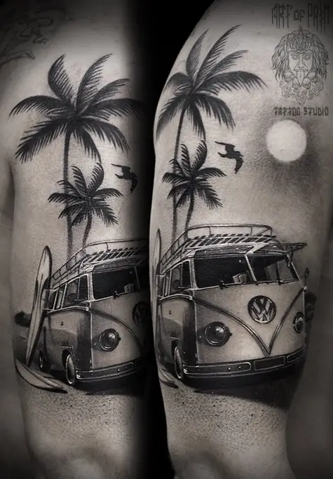 Татуировка мужская реализм на плече минивен (Слава Tech Lunatic) 2746