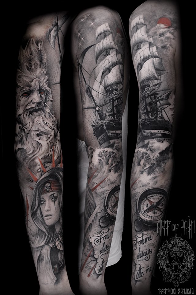 Татуировка мужская реализм тату-рукав морской, корабли, пираты (Слава Tech Lunatic) 2747