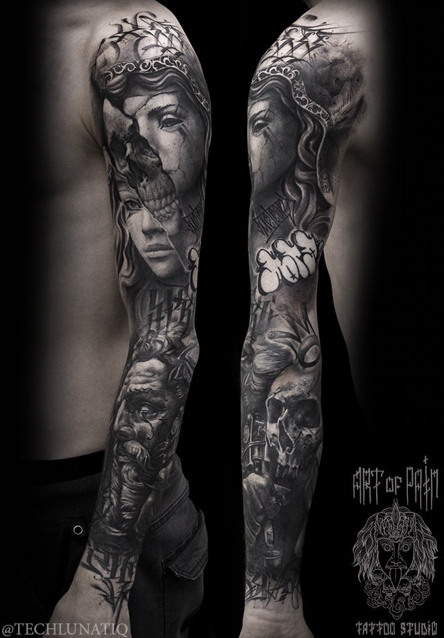 Татуировка мужская black&grey тату-рукав девушка, череп, посейдон (Слава Tech Lunatic) 2749