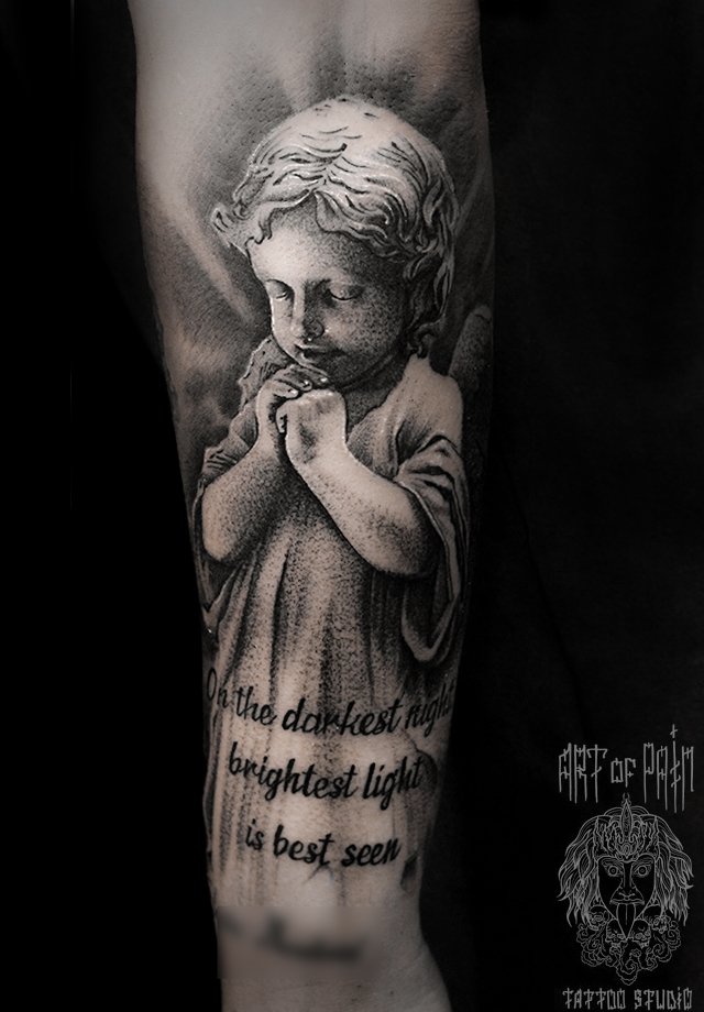 Татуировка мужская black&grey на предплечье ангел и надпись (Слава Tech Lunatic) 2751