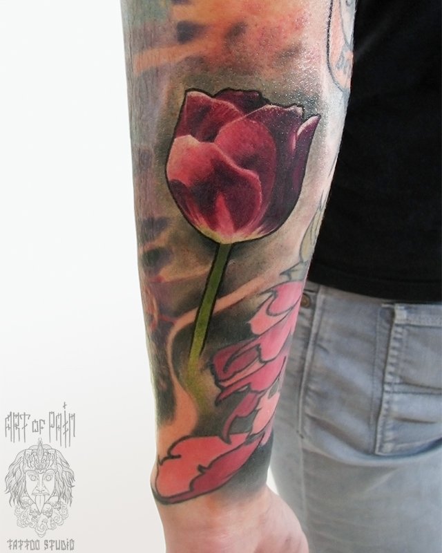Татуировка мужская нью скул на предплечье тюльпан 2866