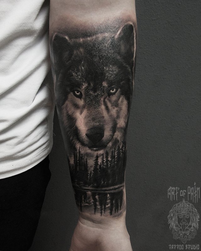 Татуировка мужская реализм на предплечье волк и лесной пейзаж 2871