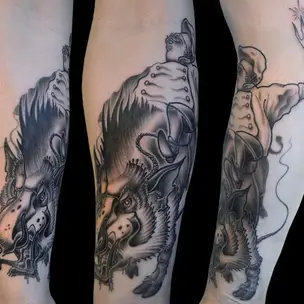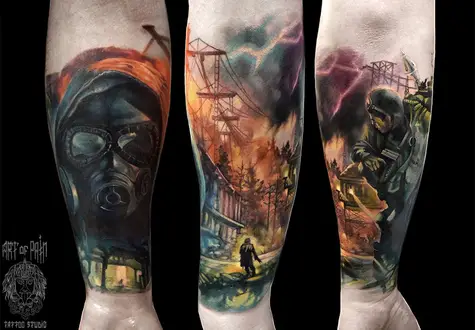 Татуировка мужская реализм на предплечье люди и пожар 2923