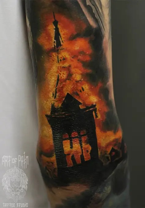 Татуировка мужская на руке реализм пожар 3017