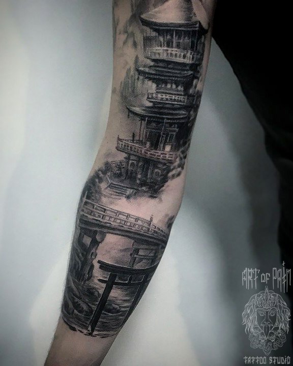 Татуировка мужская реализм на руке пагода (Юрий Хандрыкин) 3040