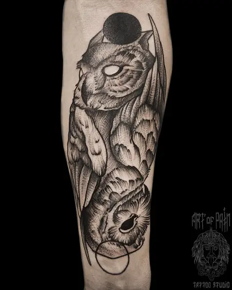 Татуировка мужская графика на предплечье совы 3043