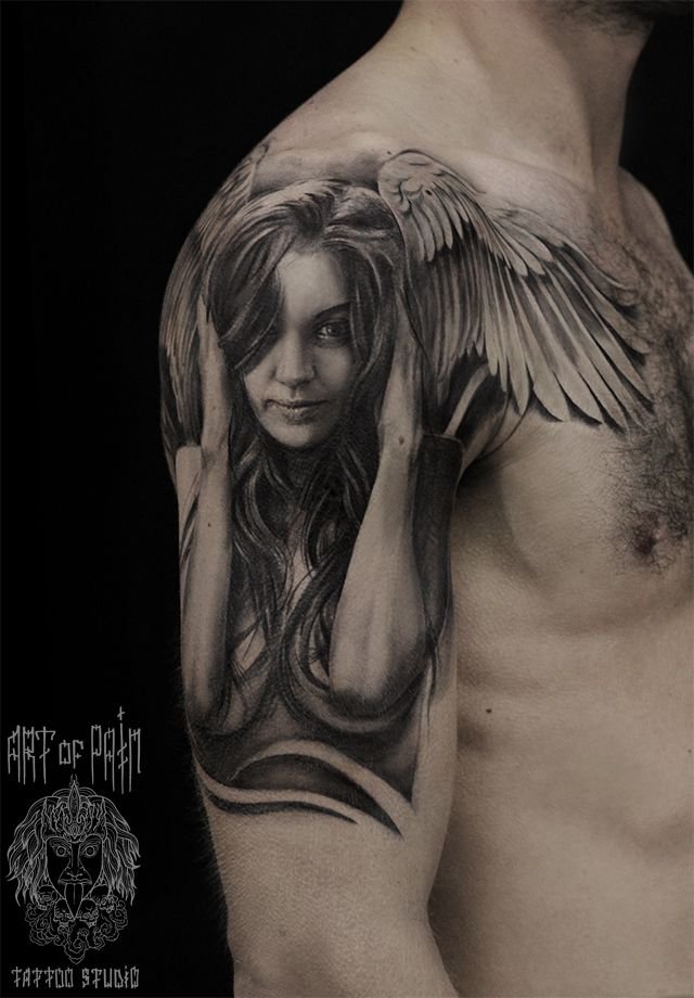 Татуировка мужская Black&Grey на плече девушка с крыльями ангела 305