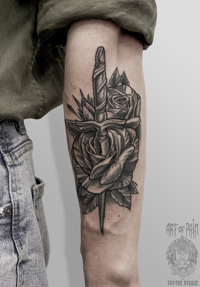 Татуировка мужская графика на предплечье роза и кинжал 3065