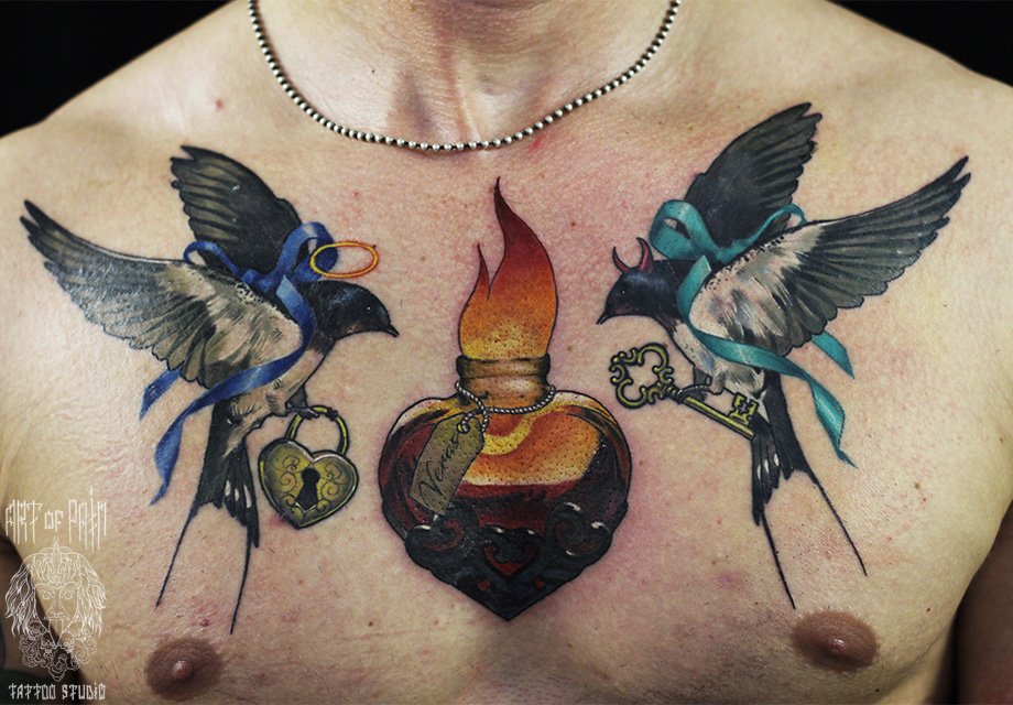 Татуировка мужская нью-скул на груди ласточки 3075
