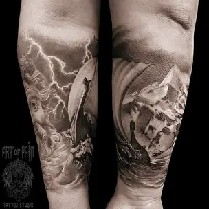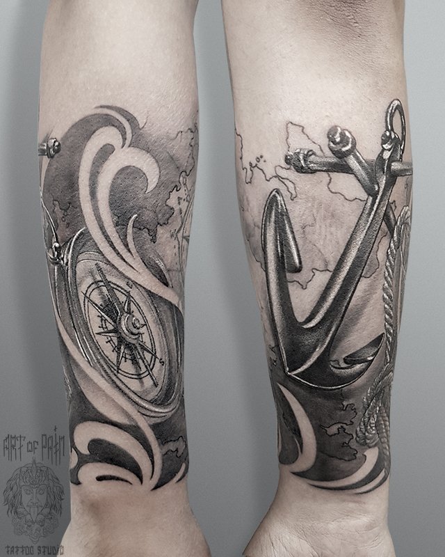 Татуировка мужская black&grey на предплечье якорь и компас 3091