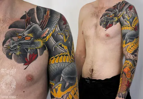 Татуировка мужская япония тату-рукав дракон и карп кои 3104