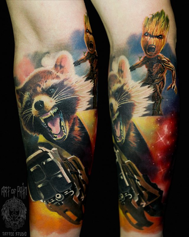 Татуировка мужская реализм на предплечье енот и грут (Александр Pusstattoo) 3109