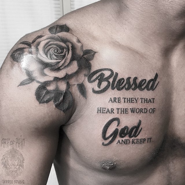 Татуировка мужская каллиграфия на груди надпись и роза 3120