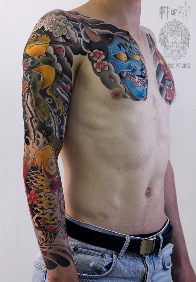 Татуировка мужская япония тату-рукав карпы и жаба 3156
