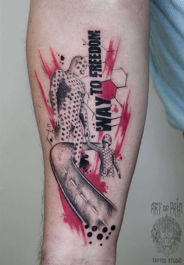 Татуировка мужская треш полька на предплечье люди и дорога 3168