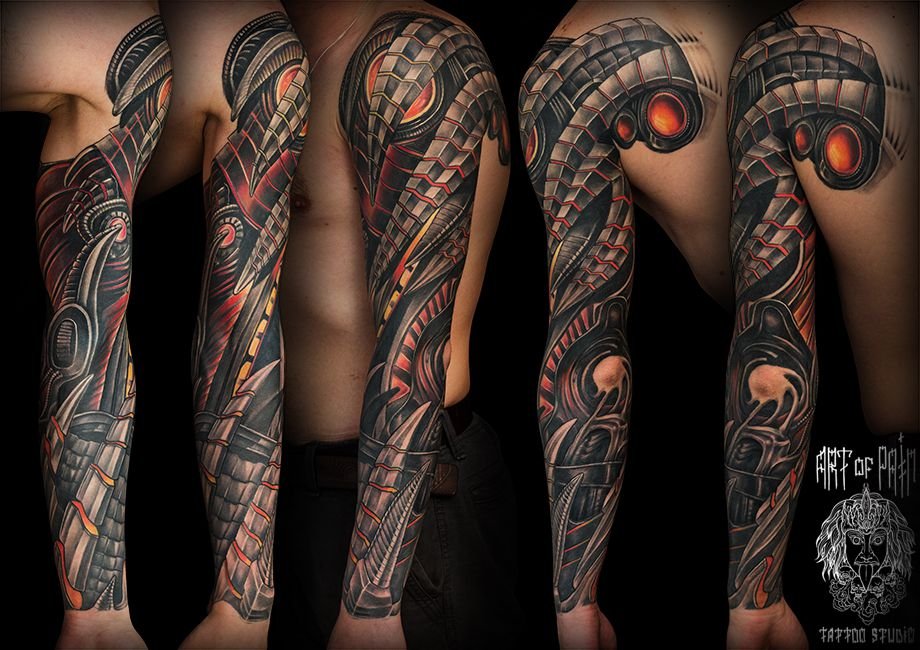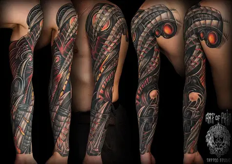 Татуировка мужская биомеханика на руке когти и механизмы 324