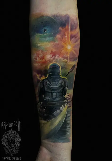 Татуировка мужская реализм на предплечье человек в лодке 3263