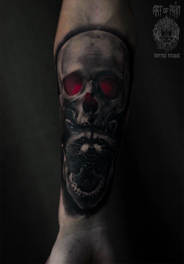 Татуировка мужская реализм на предплечье череп и енот 3314