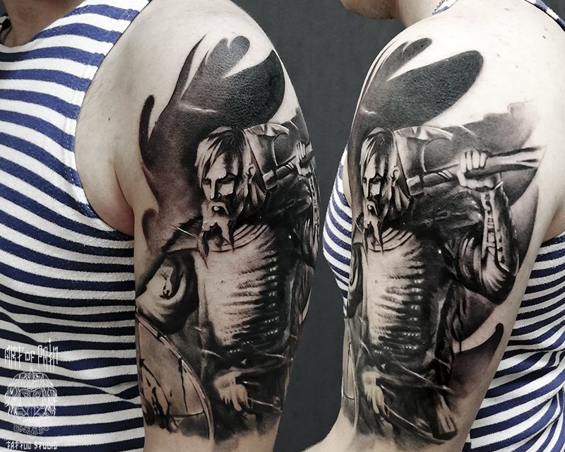 Татуировка мужская black&grey на плече воин 3334