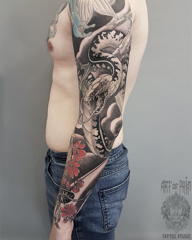 Татуировка мужская япония тату-рукав змея и сакура 3382