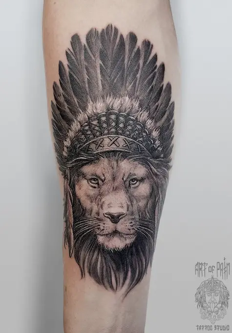 Татуировка мужская графика на предплечье лев с индейским роучем 3393
