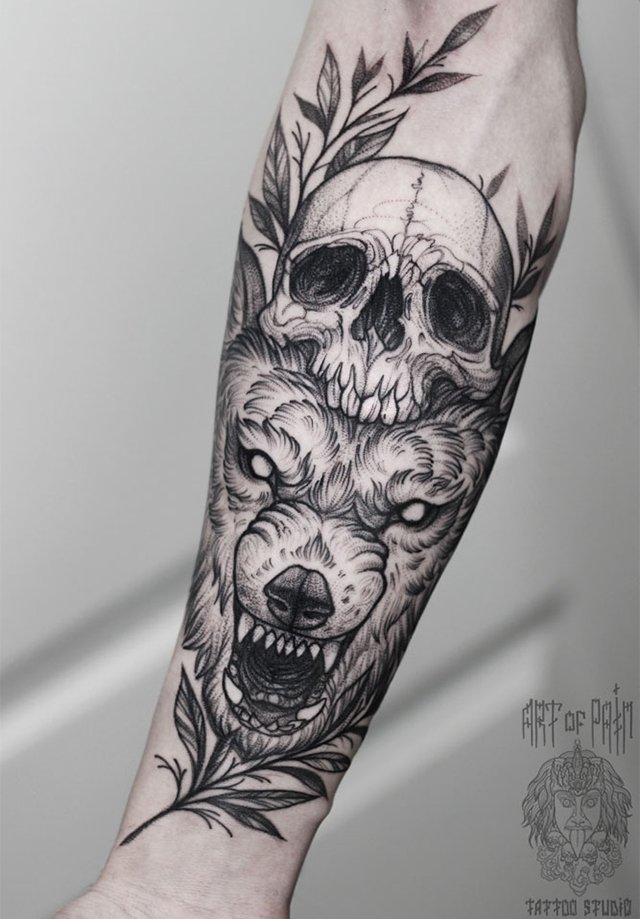 Татуировка мужская графика на предплечье волк и череп 3394
