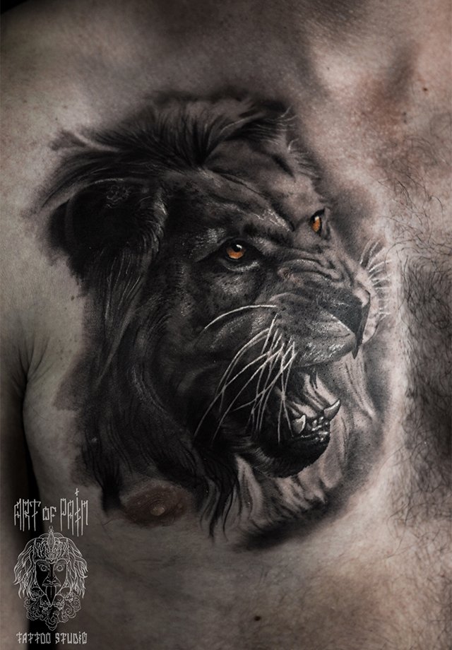 Татуировка мужская реализм на груди серый лев с желтыми глазами 3395