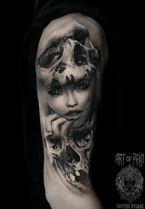Татуировка мужская реализм на плече девушка и черепа (Слава Tech Lunatic) 3401