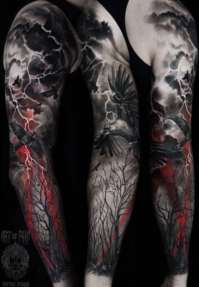 Татуировка мужская реализм тату-рукав лес и вороны (Слава Tech Lunatic) 3402