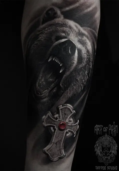 Татуировка мужская реализм на предплечье медведь и крест (Александр Pusstattoo) 3407