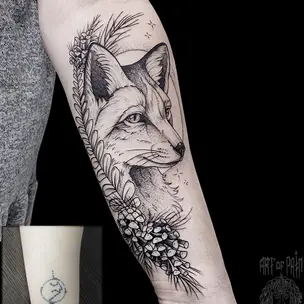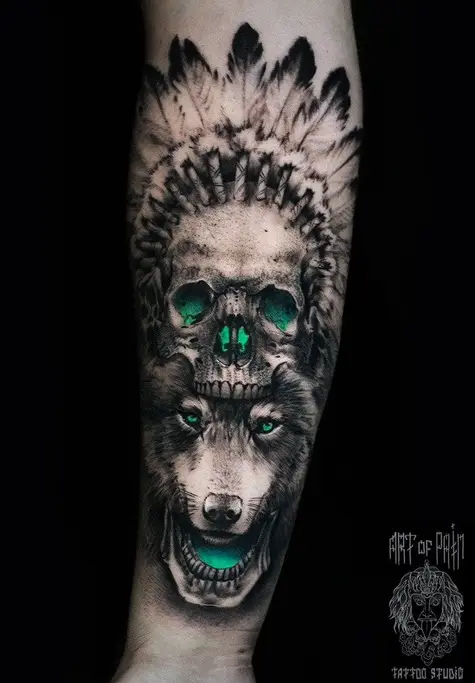 Татуировка мужская реализм на предплечье волк и череп индейца (Слава Tech Lunatic) 3417