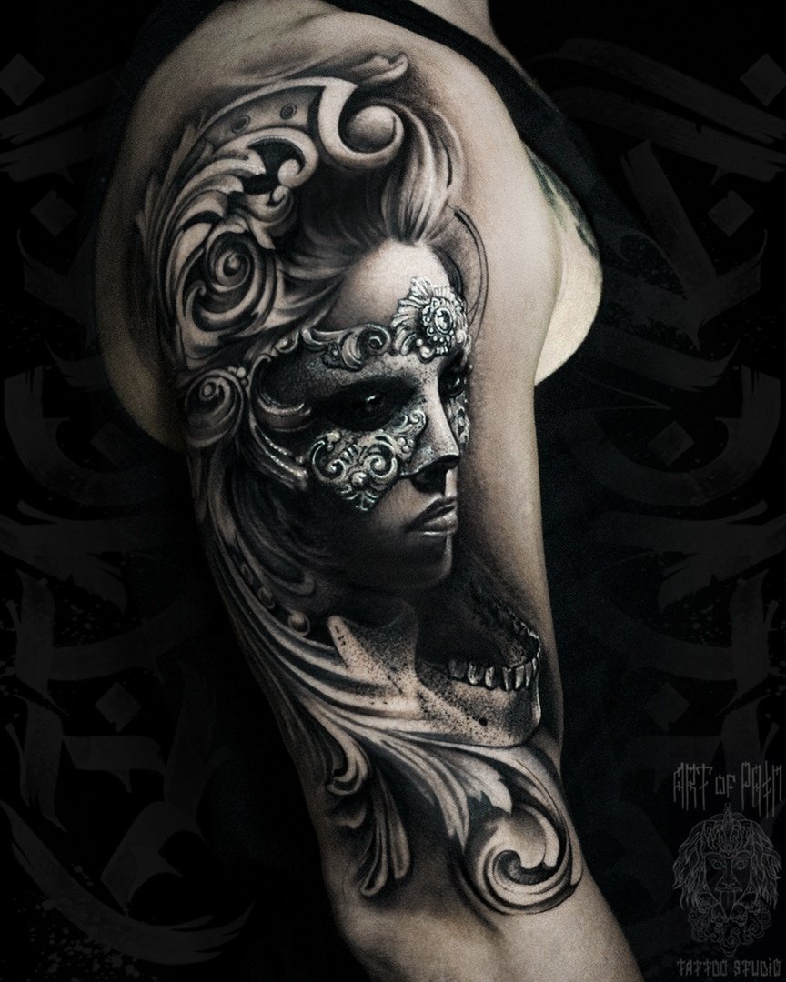 Татуировка мужская реализм на плече девушка в маске (Слава Tech Lunatic) 3431