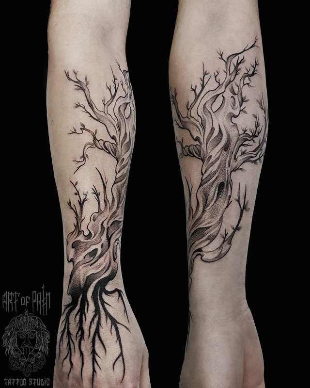Татуировка мужская графика на предплечье дерево 3651