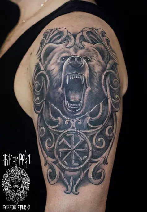 Татуировка мужская реализм на плече медведь и коловрат 370