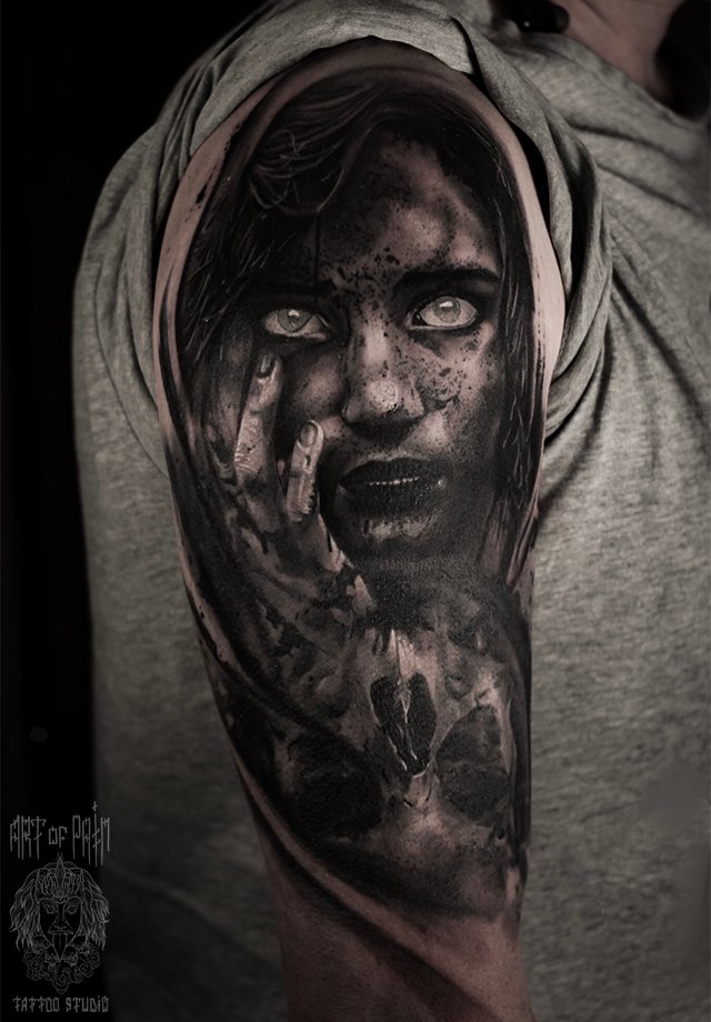 Татуировка мужская хоррор на плече девушка и череп 3722