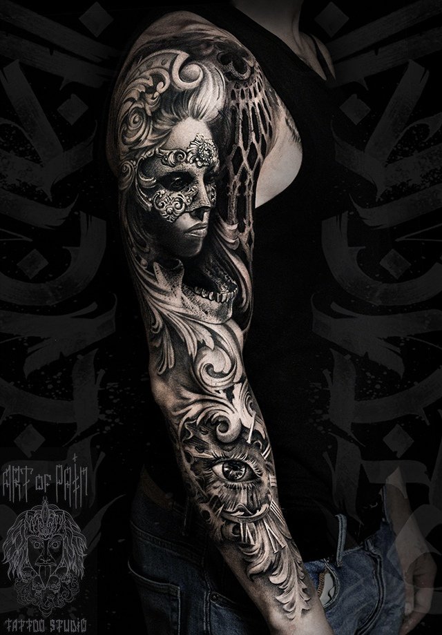 Татуировка мужская чикано тату-рукав девушка, маски, глаз (Слава Tech Lunatic) 3731