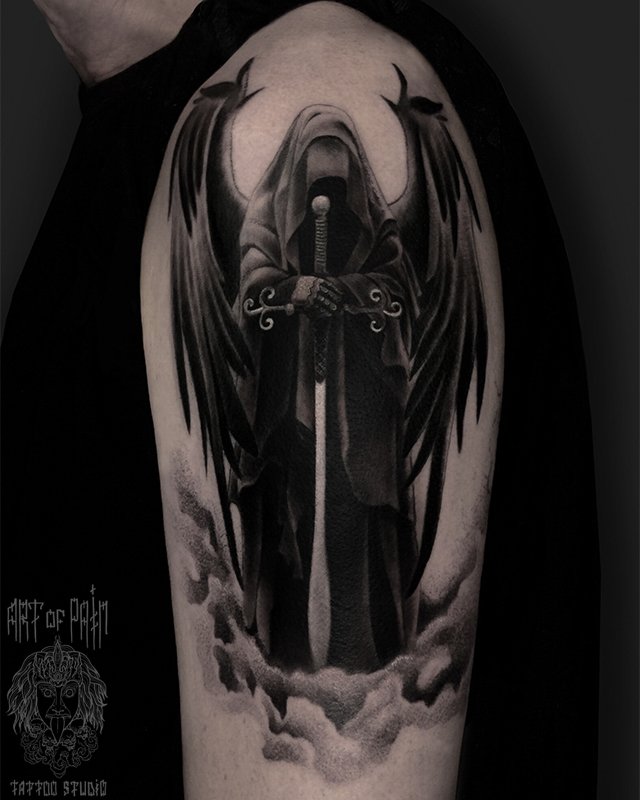 Татуировка мужская black&grey на плече черный ангел с мечом (Анастасия Юсупова) 3732