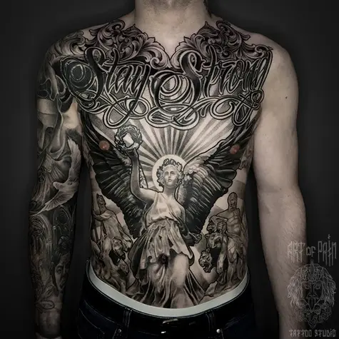 Татуировка мужская чикано на животе и груди ангел и надпись (Анастасия Юсупова) 3733