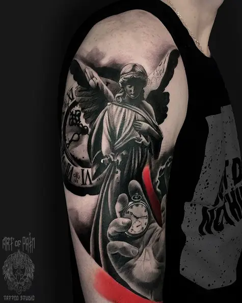 Татуировка мужская реализм на плече ангел, часы, рука (Анастасия Юсупова) 3757