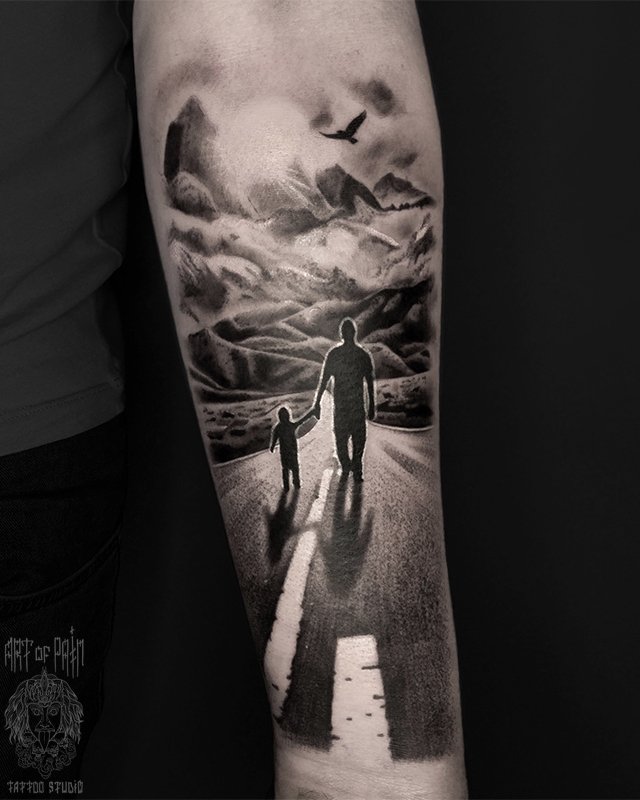 Татуировка мужская black&grey, реализм на предплечье дорога и человек с ребёнком (Анастасия Юсупова) 3771