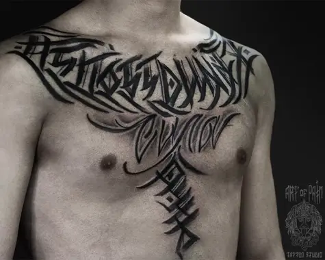 Татуировка мужская каллиграфия на груди надпись 3791